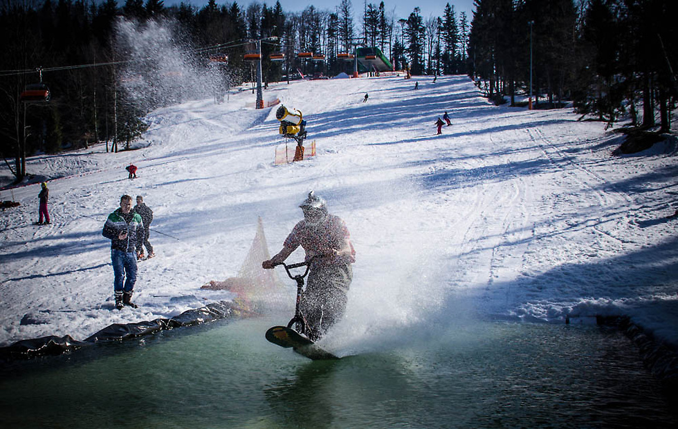 Już w sobotę rano na samym środku stoku Czarny Groń pojawił się spory basen wypełniony lodowatą wodą. Niedługo trzeba było czekać, aby pierwszy śmiałek spróbował swojego szczęścia. Narciarz w przebraniu pingwina przeciął lodowatą taflę wody, a tuż za nim ruszyli snowboardziści i cała armia narciarzy. Nie obyło się oczywiście bez upadków!
